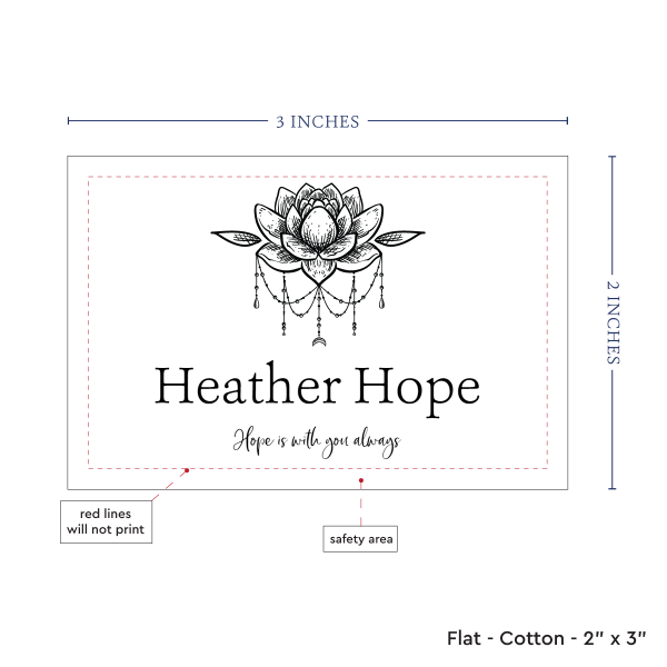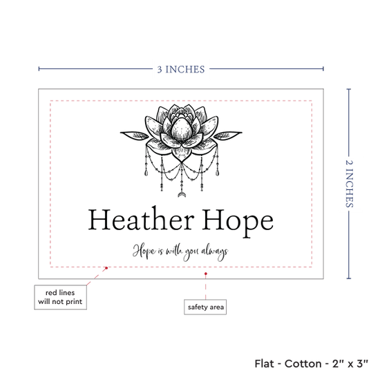 Personalized cotton labels measuring 2”x3”. Available as Flat tags in either sew on or iron on options. See below for full description and to design and preview your custom labels