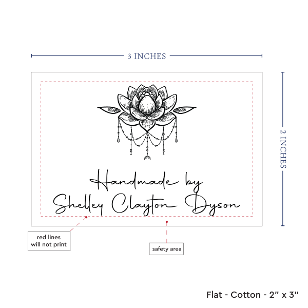 Personalized cotton labels measuring 2”x3”. Available as Flat tags in either sew on or iron on options. See below for full description and to design and preview your custom labels