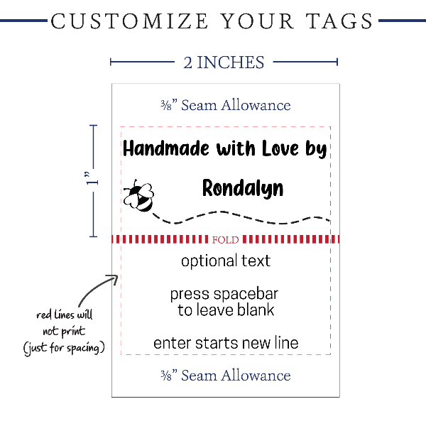 Personalized satin labels measuring 1”x2” once folded and sewn in. Printed with black ink on white satin ribbon. Cut edges should be sewn into a seam or turned under. See below for full description and to design and preview your custom labels.