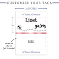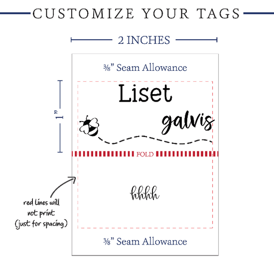 Personalized satin labels measuring 1”x2” once folded and sewn in. Printed with black ink on white satin ribbon. Cut edges should be sewn into a seam or turned under. See below for full description and to design and preview your custom labels.