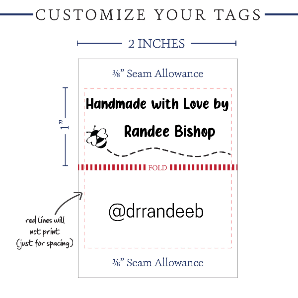 Personalized satin labels measuring 1”x2” once folded and sewn in. Printed with black ink on white satin ribbon. Cut edges should be sewn into a seam or turned under. See below for full description and to design and preview your custom labels.
