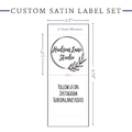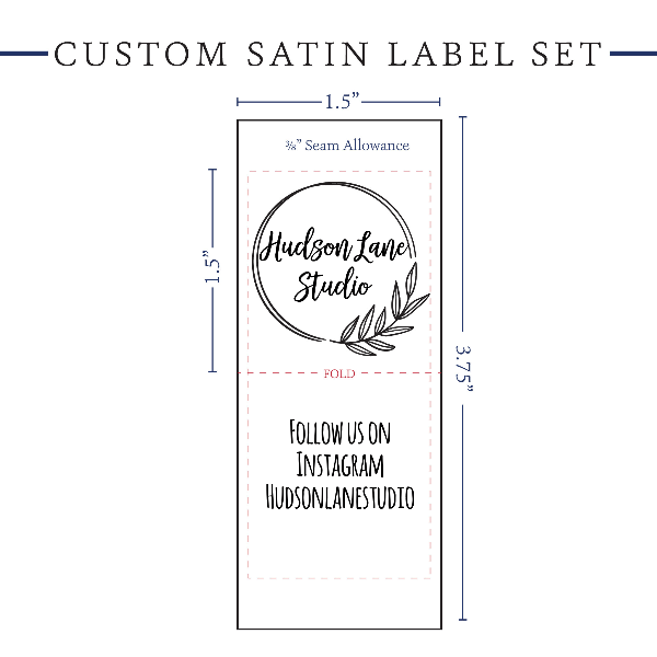 Personalized satin labels measuring 1.5”x1.5” once folded and sewn in. Printed with black ink on white satin ribbon. Cut edges should be sewn into a seam or turned under. See below for full description and to design and preview your custom labels.