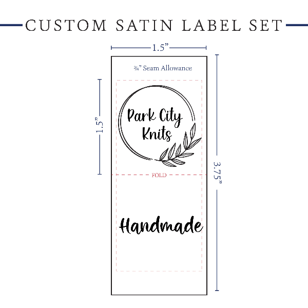 Personalized satin labels measuring 1.5”x1.5” once folded and sewn in. Printed with black ink on white satin ribbon. Cut edges should be sewn into a seam or turned under. See below for full description and to design and preview your custom labels.