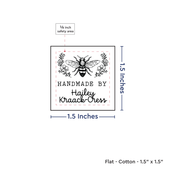 Personalized cotton labels measuring 1.5”x1.5”. Available as Flat or Fold Over tags in either sew on or iron on options. See below for full description and to design and preview your custom labels