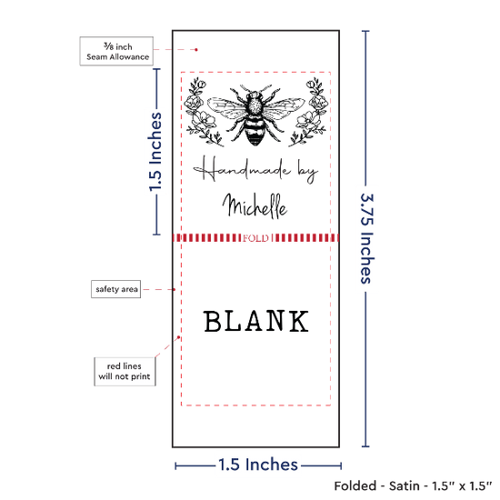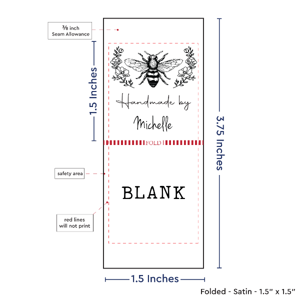 Personalized satin labels measuring 1.5”x1.5” once folded and sewn in. Printed with black ink on white satin ribbon. Cut edges should be sewn into a seam or turned under. See below for full description and to design and preview your custom labels.