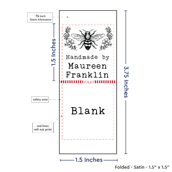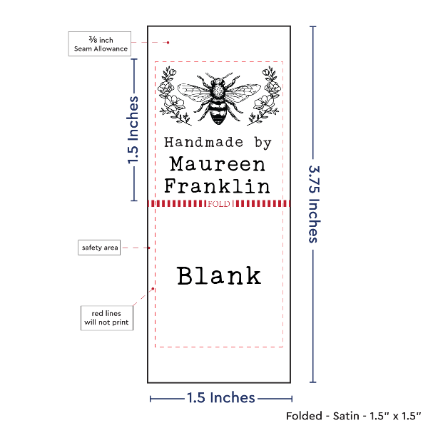 Personalized satin labels measuring 1.5”x1.5” once folded and sewn in. Printed with black ink on white satin ribbon. Cut edges should be sewn into a seam or turned under. See below for full description and to design and preview your custom labels.