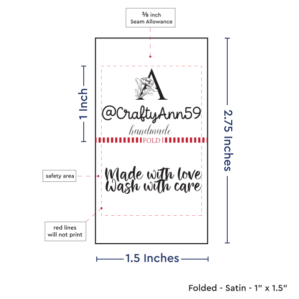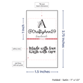 Personalized satin labels measuring 1”x1.5” once folded and sewn in. Printed with black ink on white satin ribbon. Cut edges should be sewn into a seam or turned under. See below for full description and to design and preview your custom labels.