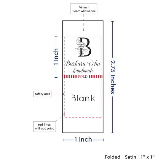 Personalized satin labels measuring 1”x1” once folded and sewn in. Printed with black ink on white satin ribbon. Cut edges should be sewn into a seam or turned under. See below for full description and to design and preview your custom labels.