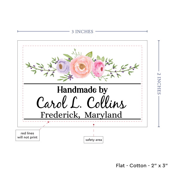 Personalized cotton labels measuring 2”x3”. Available as Flat tags in either sew on or iron on options. See below for full description and to design and preview your custom labels