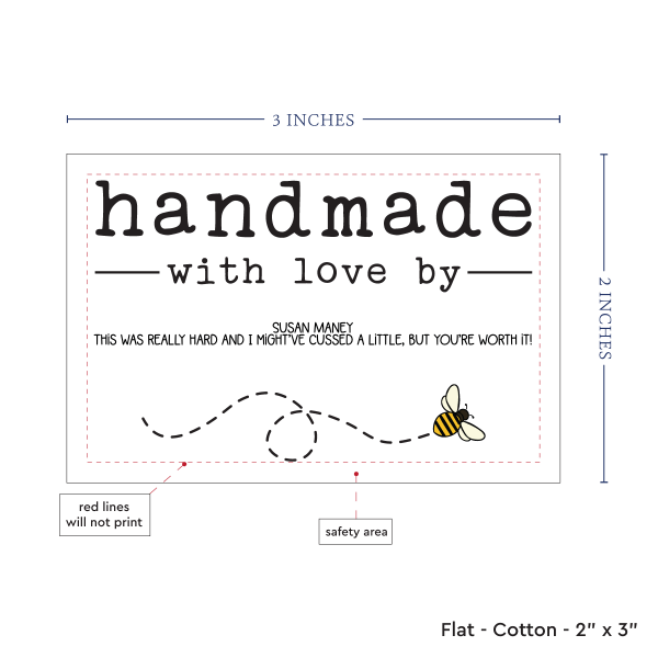 Personalized cotton labels measuring 2”x3”. Available as Flat tags in either sew on or iron on options. See below for full description and to design and preview your custom labels