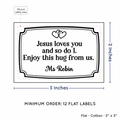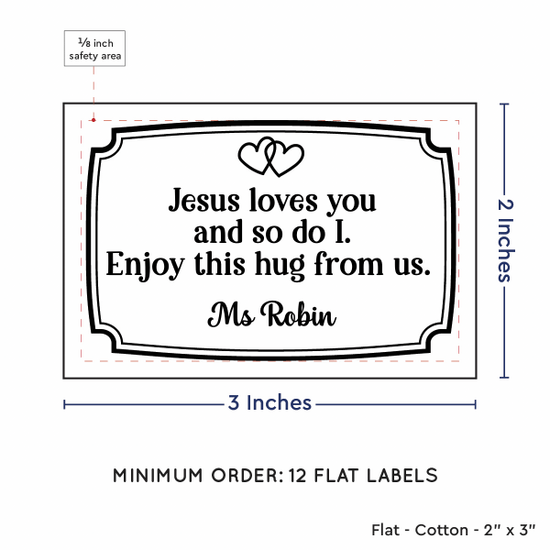 Personalized cotton labels measuring 2”x3”. Available as Flat tags in either sew on or iron on options. See below for full description and to design and preview your custom labels
