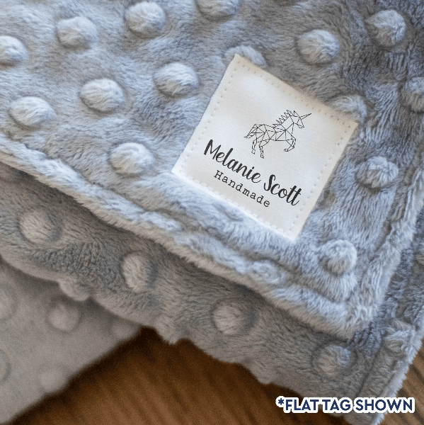 Personalized cotton labels measuring 1.5”x1.5”. Available as Flat or Fold Over tags in either sew on or iron on options. See below for full description and to design and preview your custom labels