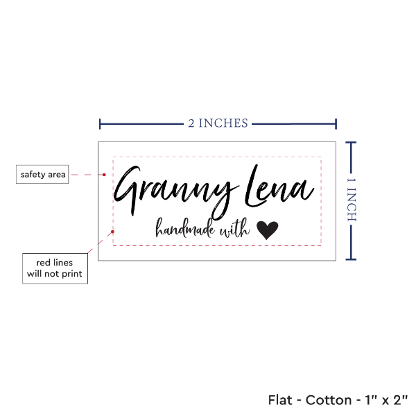 Personalized cotton labels measuring 2”x1”. Available as Flat or Fold Over tags in either sew on or iron on options. See below for full description and to design and preview your custom labels