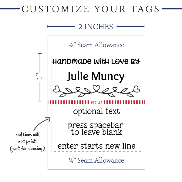 Personalized satin labels measuring 1”x2” once folded and sewn in. Printed with black ink on white satin ribbon. Cut edges should be sewn into a seam or turned under. See below for full description and to design and preview your custom labels.