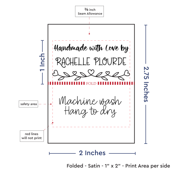 Personalized satin labels measuring 1”x2” once folded and sewn in. Printed with black ink on white satin ribbon. Cut edges should be sewn into a seam or turned under. See below for full description and to design and preview your custom labels.