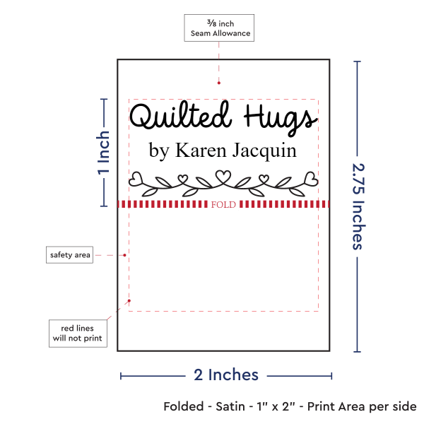 Personalized satin labels measuring 1”x2” once folded and sewn in. Printed with black ink on white satin ribbon. Cut edges should be sewn into a seam or turned under. See below for full description and to design and preview your custom labels.