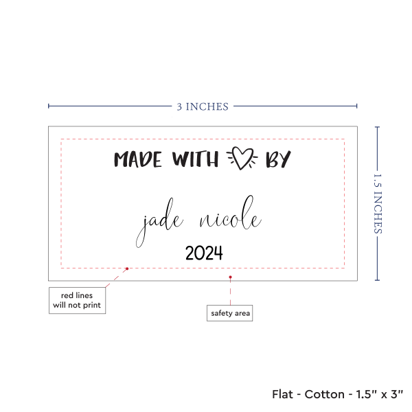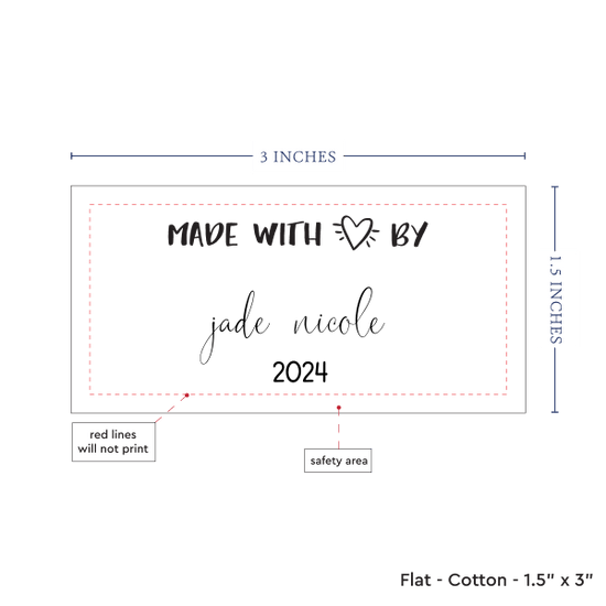 Personalized cotton labels measuring 1.5”x3”. Available as Flat labels in either sew on or iron on options. See below for full description and to design and preview your custom labels