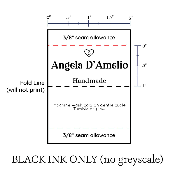 Personalized satin labels measuring 1”x2” once folded and sewn in. Printed with black ink on white satin ribbon. Cut edges should be sewn into a seam or turned under. See below for full description and to design and preview your custom labels.