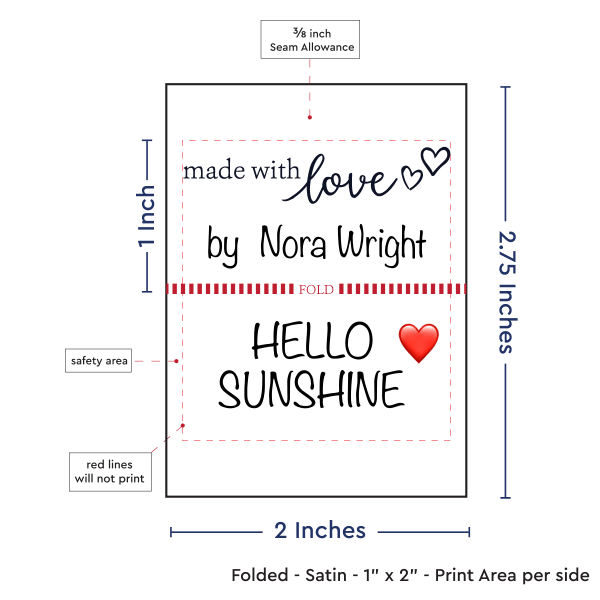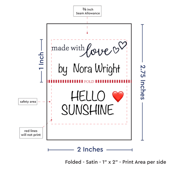 Personalized satin labels measuring 1”x2” once folded and sewn in. Printed with black ink on white satin ribbon. Cut edges should be sewn into a seam or turned under. See below for full description and to design and preview your custom labels.