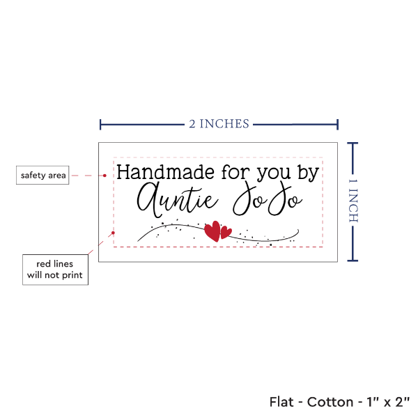 Personalized cotton labels measuring 2”x1”. Available as Flat or Fold Over tags in either sew on or iron on options. See below for full description and to design and preview your custom labels