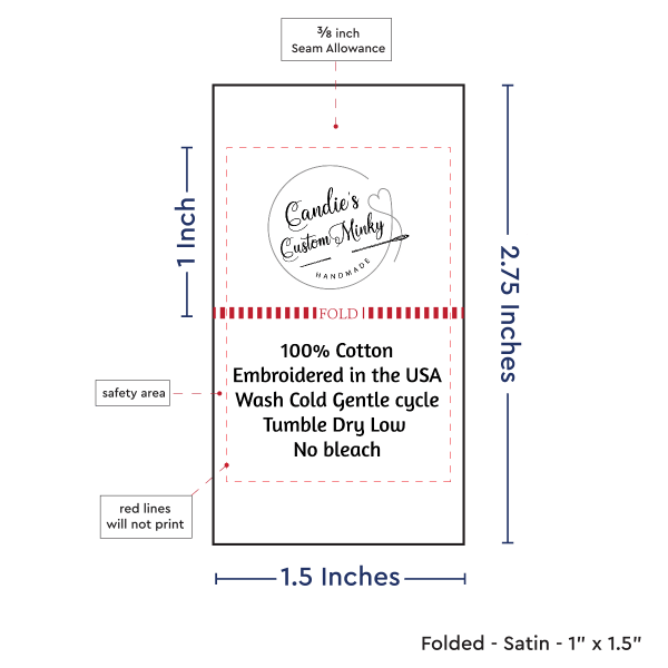Personalized satin labels. Printed with black ink on white satin ribbon. Cut edges should be sewn into a seam or turned under. See below for full description and to design and preview your custom labels.