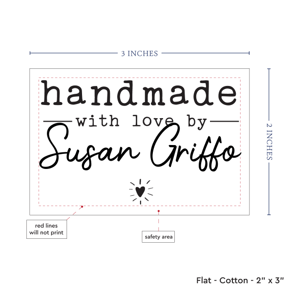 Personalized cotton labels measuring 2”x3”. Available as Flat tags in either sew on or iron on options. See below for full description and to design and preview your custom labels