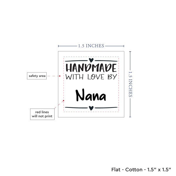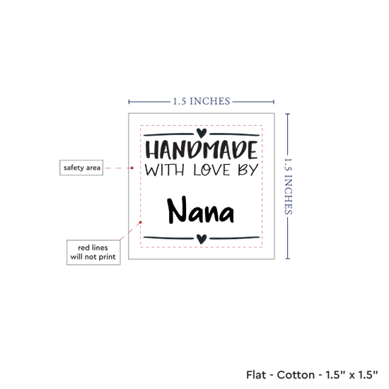 Personalized cotton labels measuring 1.5”x1.5”. Available as Flat or Fold Over tags in either sew on or iron on options. See below for full description and to design and preview your custom labels