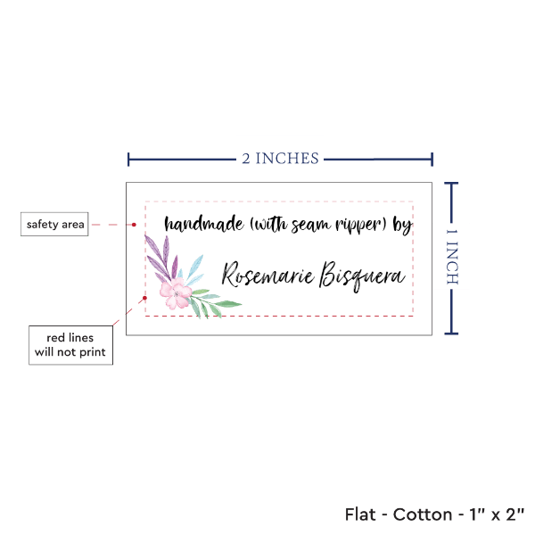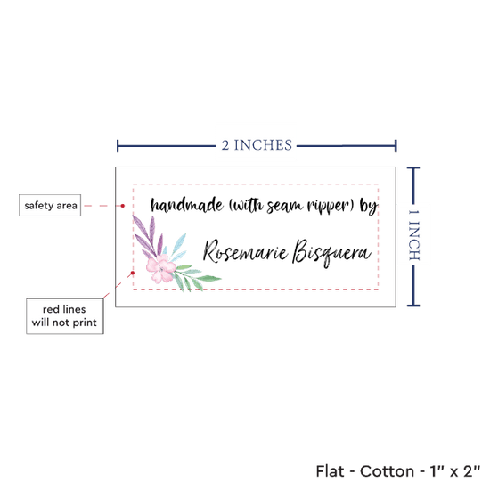 Personalized cotton labels measuring 2”x1”. Available as Flat or Fold Over tags in either sew on or iron on options. See below for full description and to design and preview your custom labels