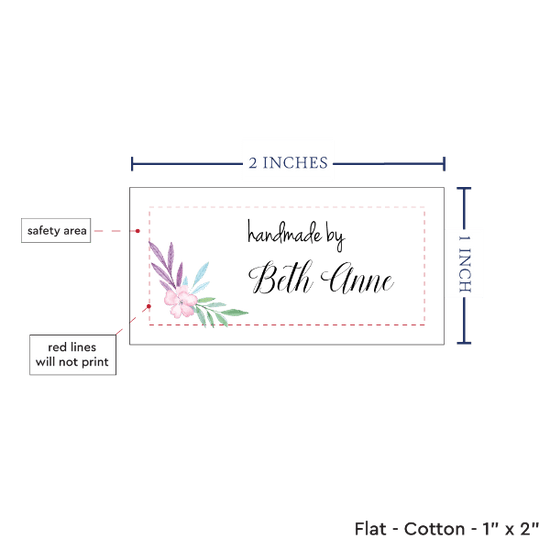 Personalized cotton labels measuring 2”x1”. Available as Flat or Fold Over tags in either sew on or iron on options. See below for full description and to design and preview your custom labels
