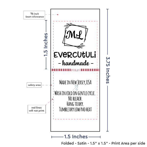 Personalized satin labels measuring 1.5”x1.5” once folded and sewn in. Printed with black ink on white satin ribbon. Cut edges should be sewn into a seam or turned under. See below for full description and to design and preview your custom labels.