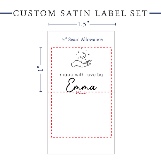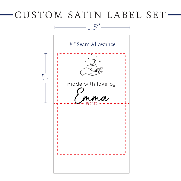 Personalized satin labels measuring 1”x1.5” once folded and sewn in. Printed with black ink on white satin ribbon. Cut edges should be sewn into a seam or turned under. See below for full description and to design and preview your custom labels.