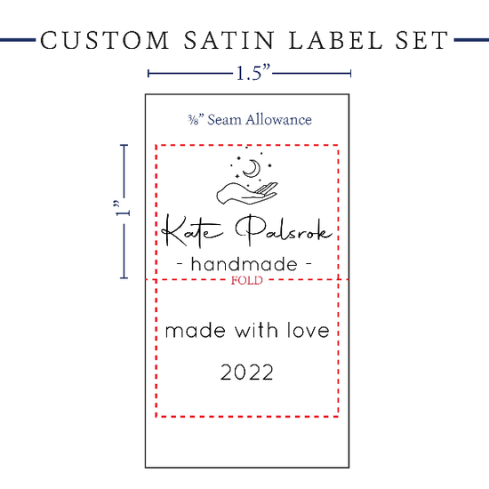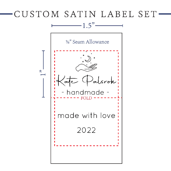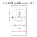 Personalized satin labels measuring 1”x1.5” once folded and sewn in. Printed with black ink on white satin ribbon. Cut edges should be sewn into a seam or turned under. See below for full description and to design and preview your custom labels.