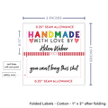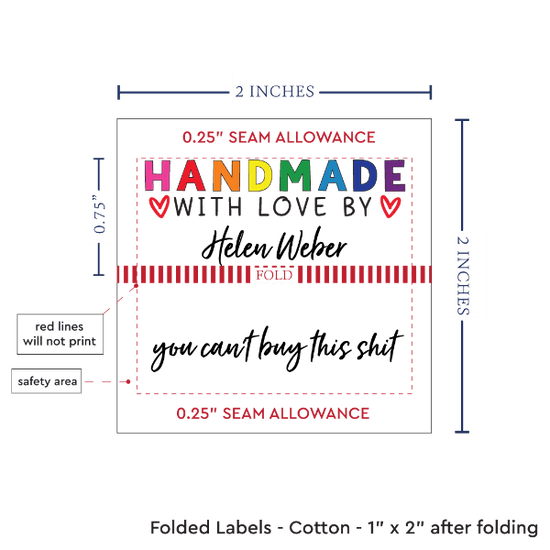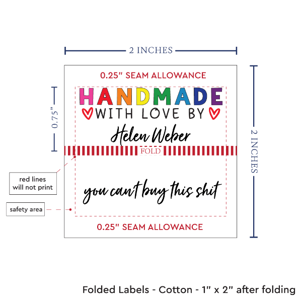 Personalized cotton labels measuring 2”x1”. Available as Flat or Fold Over tags in either sew on or iron on options. See below for full description and to design and preview your custom labels