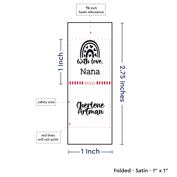 Personalized satin labels measuring 1.5”x1.5” once folded and sewn in. Printed with black ink on white satin ribbon. Cut edges should be sewn into a seam or turned under. See below for full description and to design and preview your custom labels.