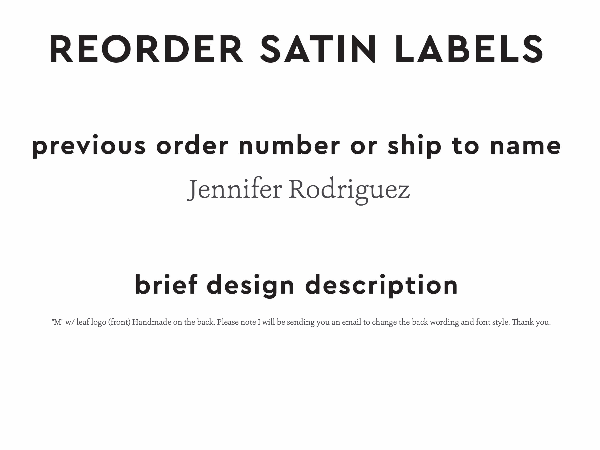 Reorder SATIN Labels previously purchased from EverEmblem. Provide the name the previous order was shipped to for easy reorders