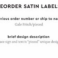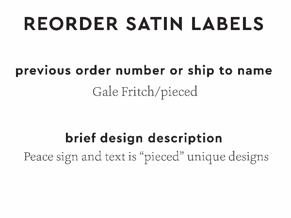 Reorder SATIN Labels previously purchased from EverEmblem. Provide the name the previous order was shipped to for easy reorders