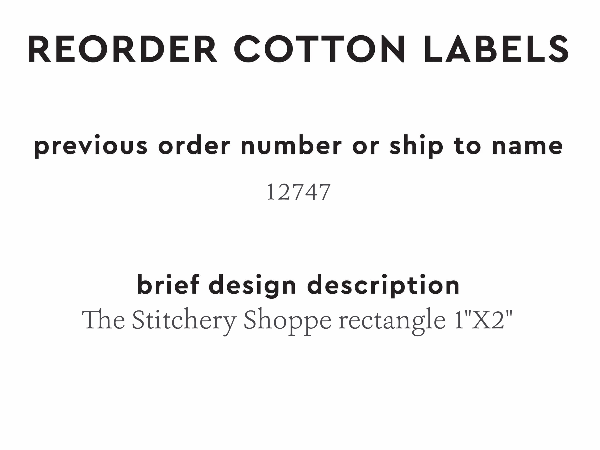 Reorder COTTON Labels previously purchased from EverEmblem. Provide the name the previous order was shipped to for easy reorders