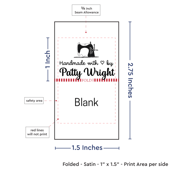 Personalized satin labels measuring 1”x1.5” once folded and sewn in. Printed with black ink on white satin ribbon. Cut edges should be sewn into a seam or turned under. See below for full description and to design and preview your custom labels.