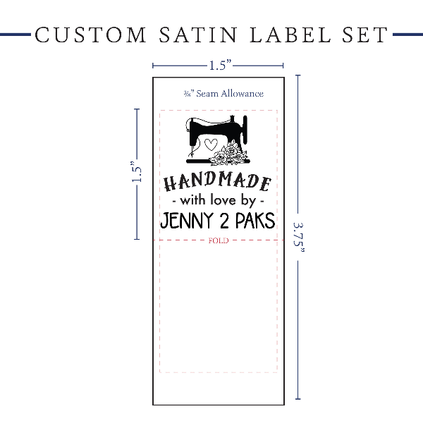 Personalized satin labels measuring 1.5”x1.5” once folded and sewn in. Printed with black ink on white satin ribbon. Cut edges should be sewn into a seam or turned under. See below for full description and to design and preview your custom labels.