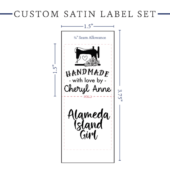 Personalized satin labels measuring 1.5”x1.5” once folded and sewn in. Printed with black ink on white satin ribbon. Cut edges should be sewn into a seam or turned under. See below for full description and to design and preview your custom labels.