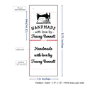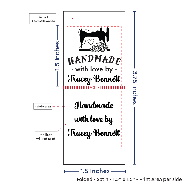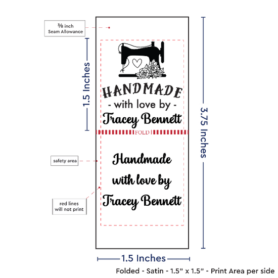 Personalized satin labels measuring 1.5”x1.5” once folded and sewn in. Printed with black ink on white satin ribbon. Cut edges should be sewn into a seam or turned under. See below for full description and to design and preview your custom labels.