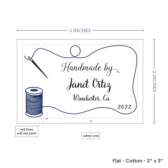 Personalized cotton labels measuring 2”x3”. Available as Flat tags in either sew on or iron on options. See below for full description and to design and preview your custom labels
