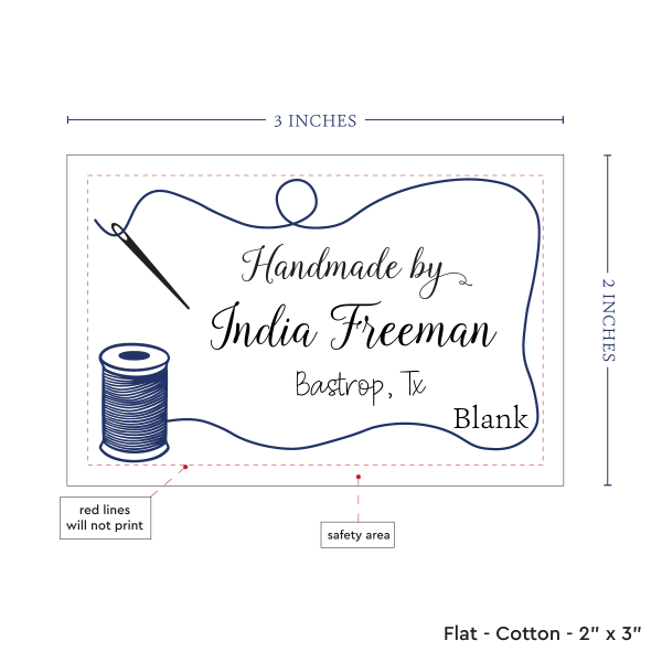 Personalized cotton labels measuring 2”x3”. Available as Flat tags in either sew on or iron on options. See below for full description and to design and preview your custom labels