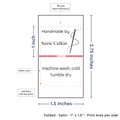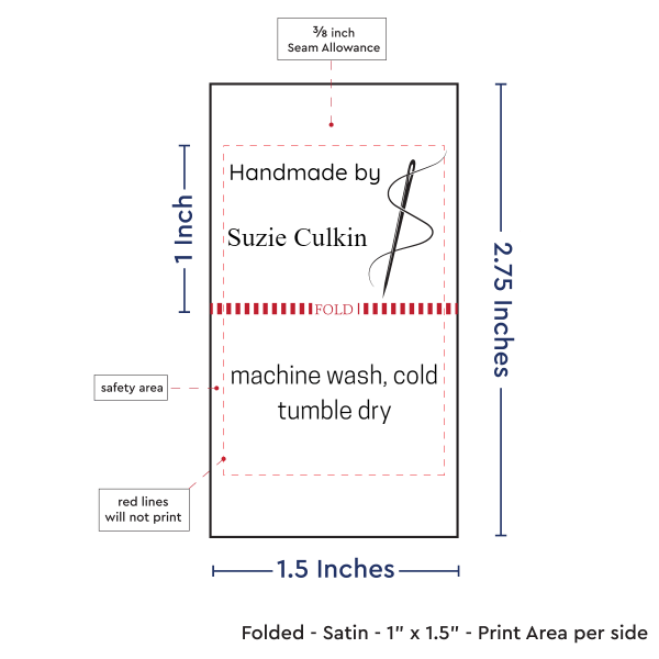 Personalized satin labels measuring 1”x1.5” once folded and sewn in. Printed with black ink on white satin ribbon. Cut edges should be sewn into a seam or turned under. See below for full description and to design and preview your custom labels.