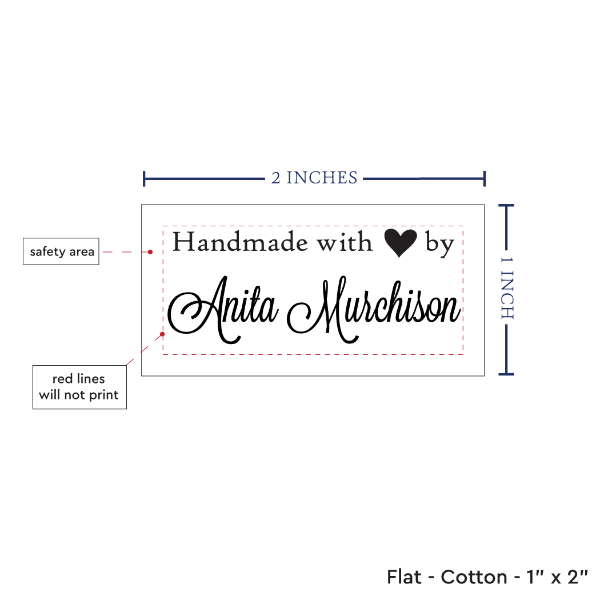 Personalized cotton labels measuring 2”x1”. Available as Flat or Fold Over tags in either sew on or iron on options. See below for full description and to design and preview your custom labels