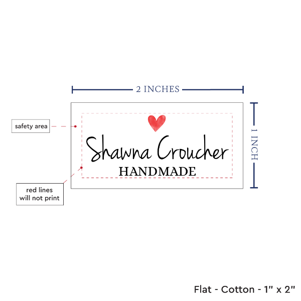 Personalized cotton labels measuring 2”x1”. Available as Flat or Fold Over tags in either sew on or iron on options. See below for full description and to design and preview your custom labels