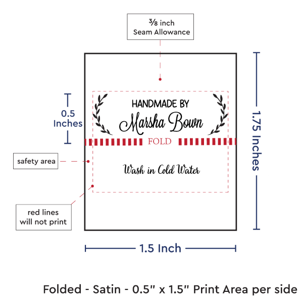 Personalized satin labels measuring 0.5”x1.5” once folded and sewn in. Printed with black ink on white satin ribbon. Cut edges should be sewn into a seam or turned under. See below for full description and to design and preview your custom labels.