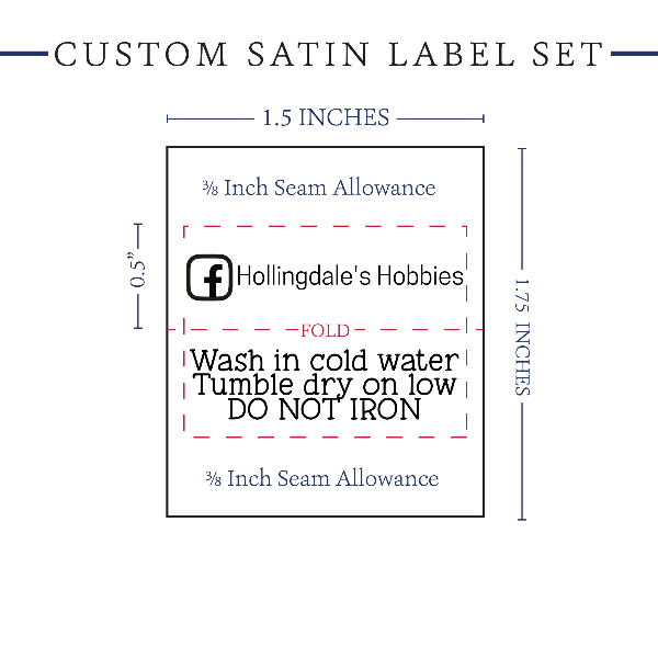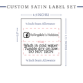 Personalized satin labels measuring 0.5”x1.5” once folded and sewn in. Printed with black ink on white satin ribbon. Cut edges should be sewn into a seam or turned under. See below for full description and to design and preview your custom labels.