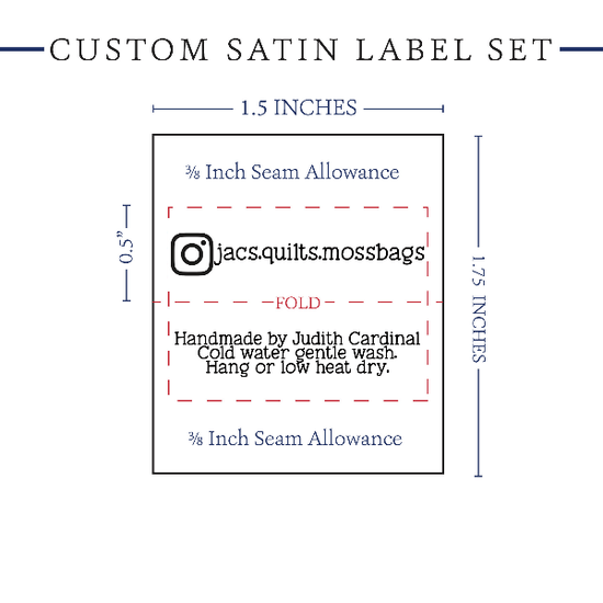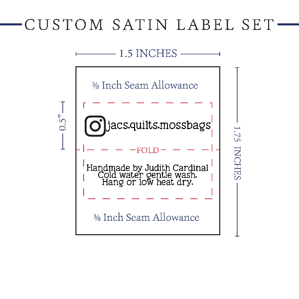 Personalized satin labels measuring 0.5”x1.5” once folded and sewn in. Printed with black ink on white satin ribbon. Cut edges should be sewn into a seam or turned under. See below for full description and to design and preview your custom labels.