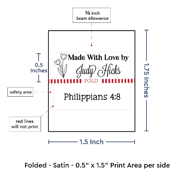 Personalized satin labels measuring 0.5”x1.5” once folded and sewn in. Printed with black ink on white satin ribbon. Cut edges should be sewn into a seam or turned under. See below for full description and to design and preview your custom labels.